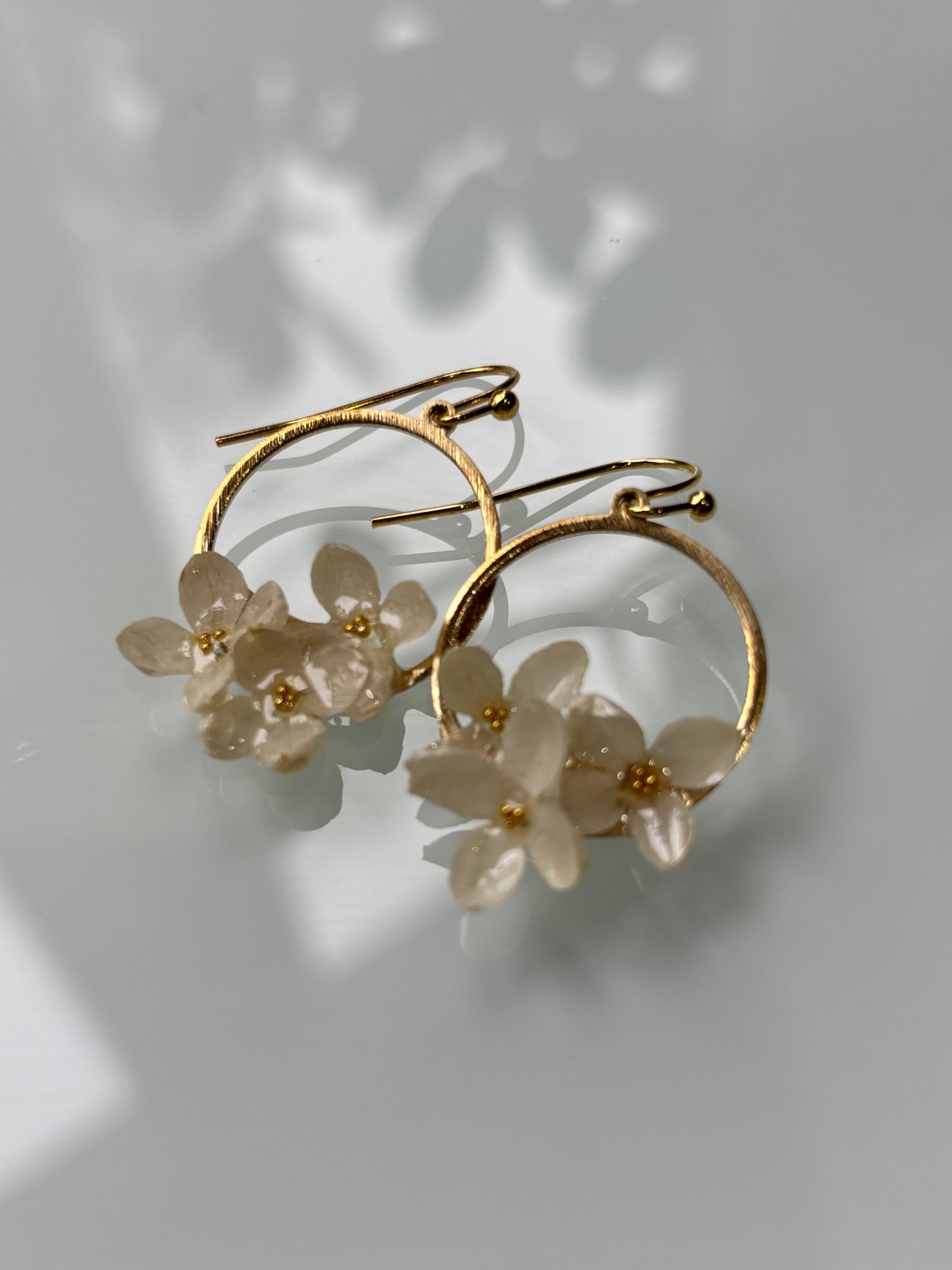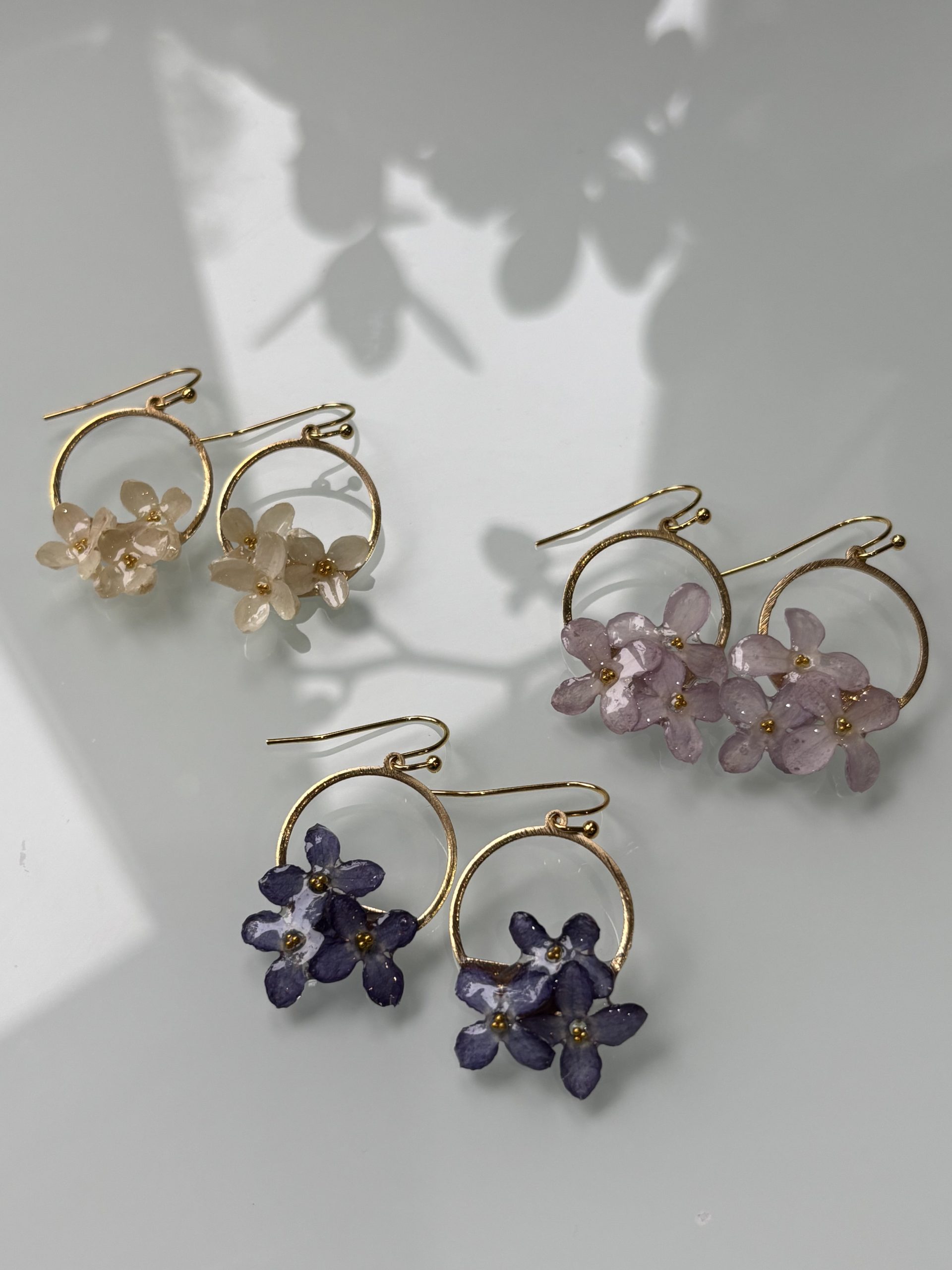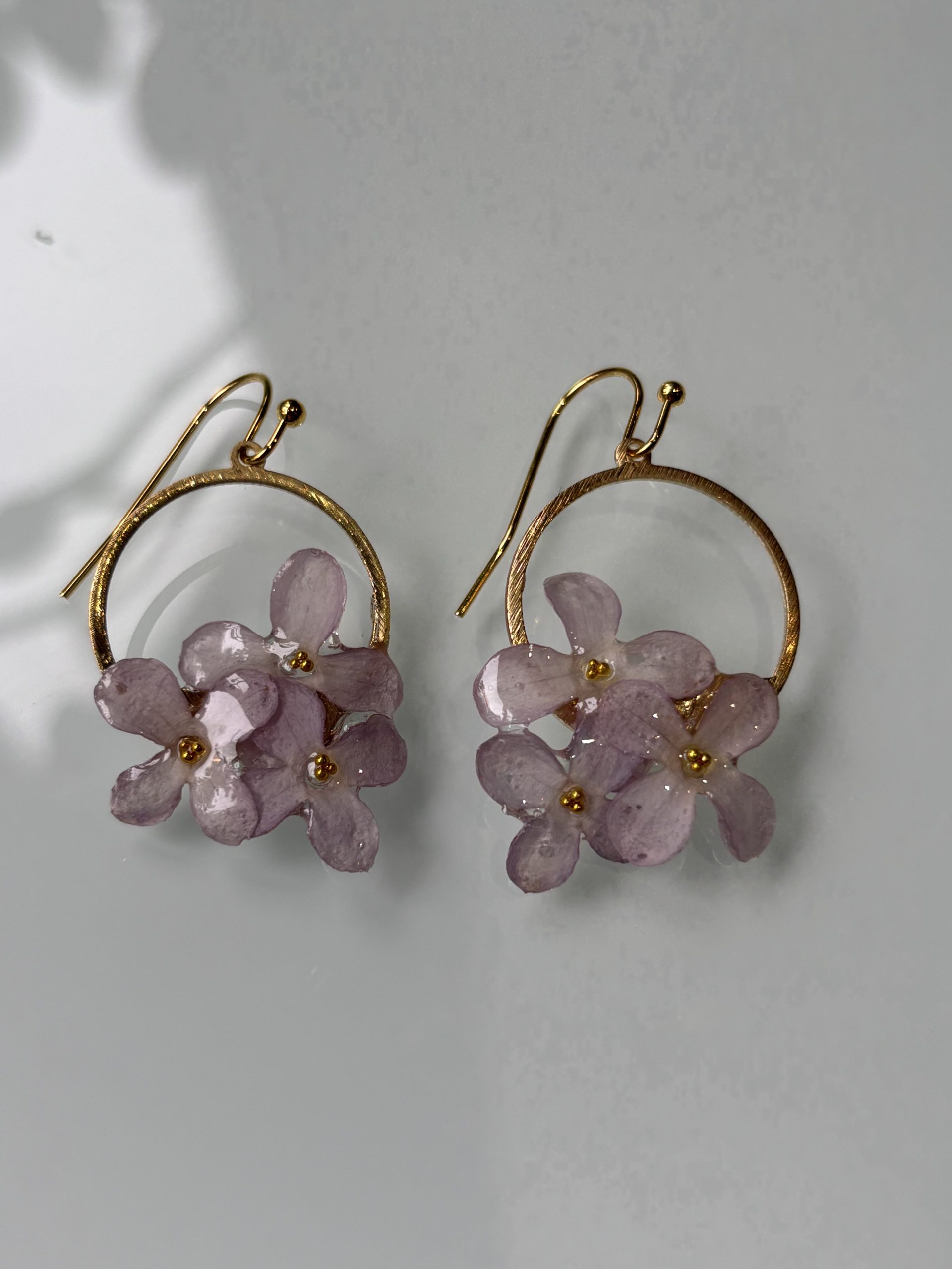 Ceriņu auskari, ielieti caurspīdīgā epoksīdā un papildināti ar smalkām perlītēm, viegli iemirdzas uz nerūsējoša tērauda apļa. Ziedu trauslais skaistums apvienojas ar perļu eleganci un mūsdienīgu metāla formu.